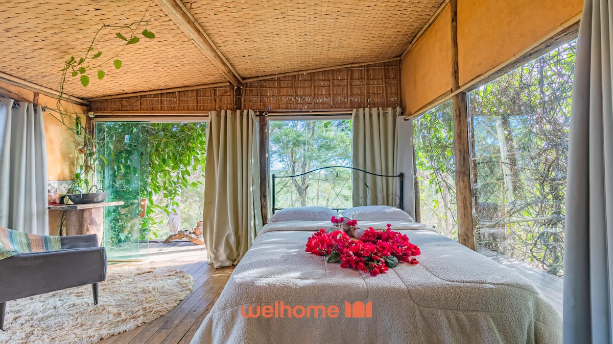 Experimente dias de paz em um chalé rústico, feito à mão com pau a pique, no coração de um sítio de permacultura. Localizado em Taubaté, rodeado por uma plantação de melaleucas e com vista para as montanhas, o espaço oferece uma banheira tradicional** (não hidro), roupa de cama, toalhas, estacionamento e total privacidade. Um refúgio para quem deseja desacelerar, se reconectar com a natureza e viver o essencial.