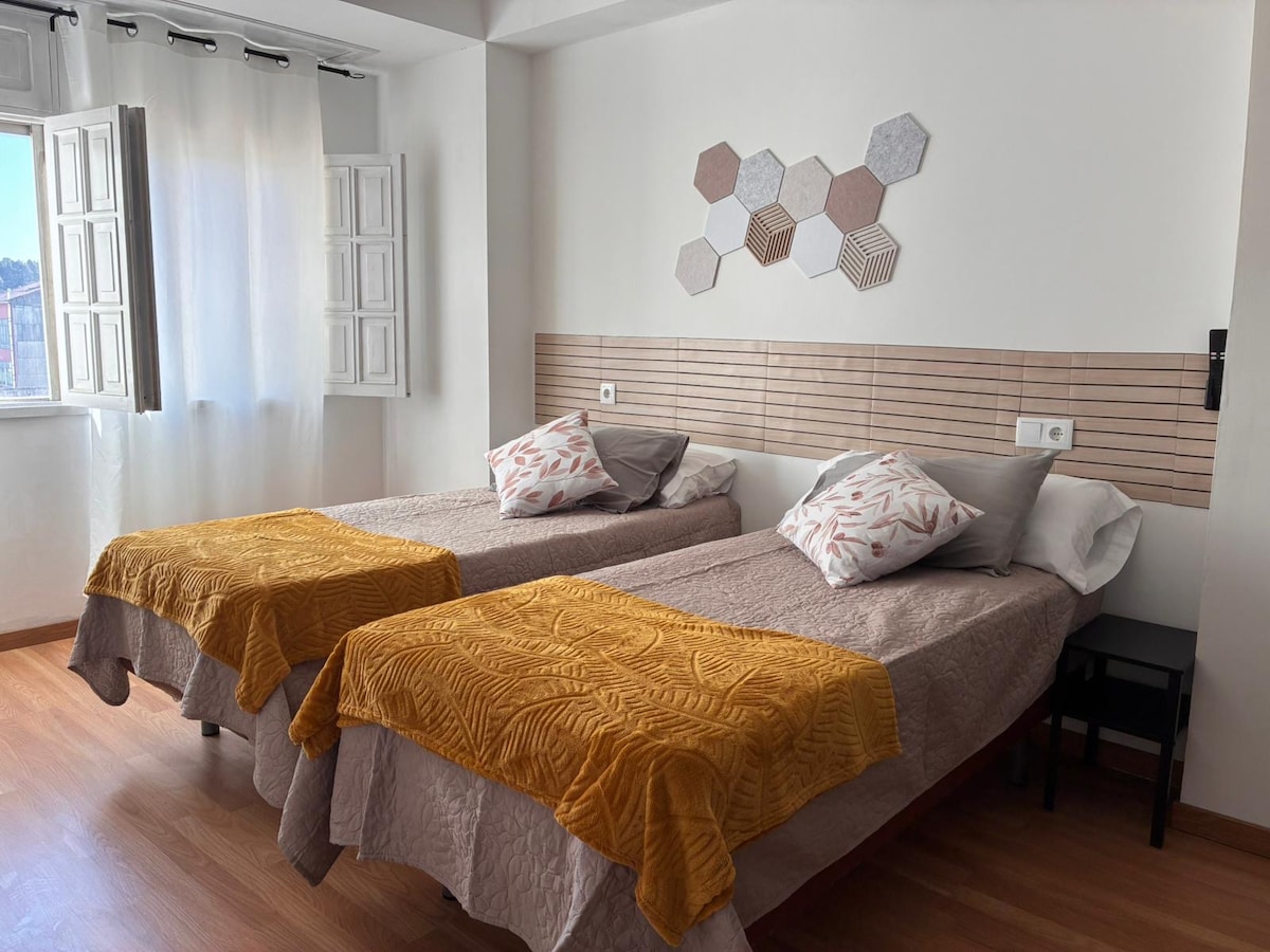 Double room with breakfast included and two single beds joined together. There is the possibility of separating them and turning it into a double upon request and availability. One of the rooms is adapted, with low furniture, bathroom and adapted shower. Rooms equipped with maximum comfort rest equipment, relaxing lighting, work area, full bathroom with large hydromassage shower space, large format Smart TV, pillow menu, individual air conditioning.