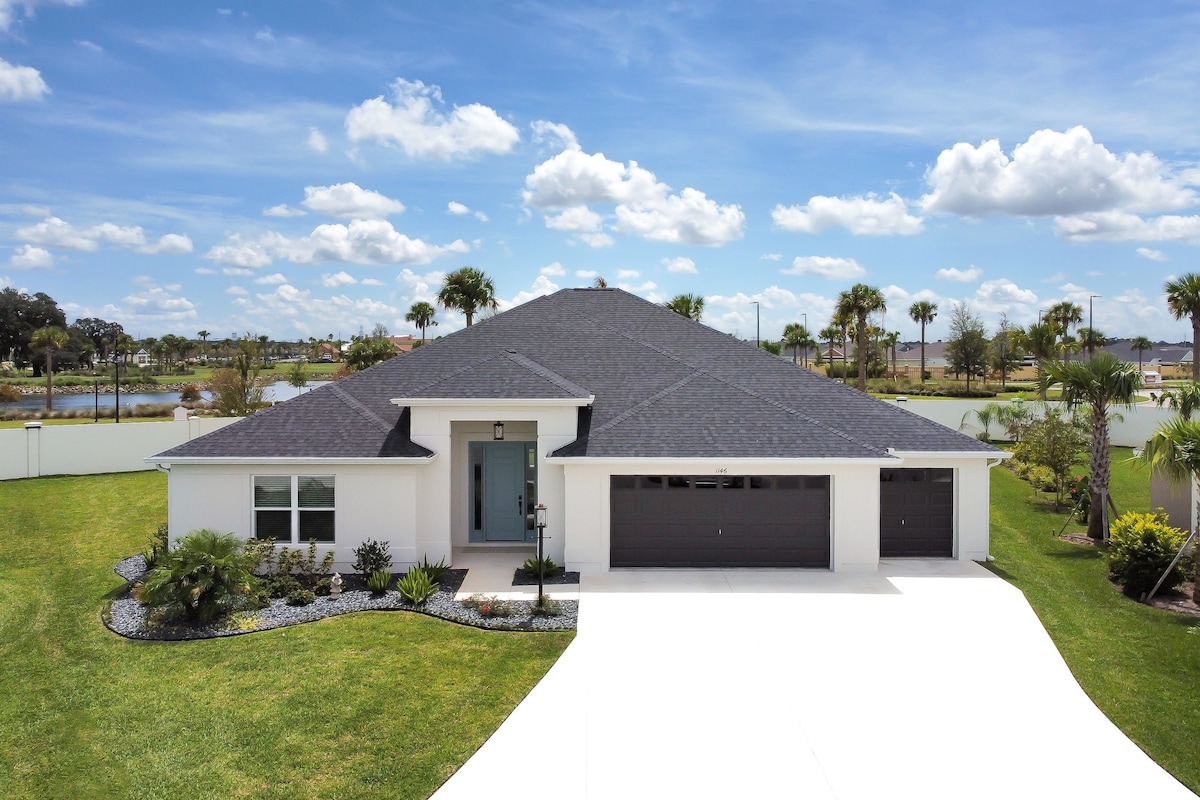Kick back and relax in this calm, stylish new villa in the Villages. It is within walking or a 3 minute golf cart ride to Brownwood Town Center where there are dining, shopping and nightly music. It is also near Lake Okahumpka Recreation Center where you can fish or kayak. This area has beautiful nature trails for walking or biking with separate golf cart paths. There is a neighborhood pool and other amenities nearby. It also comes with a complementary golf cart for your convenience.