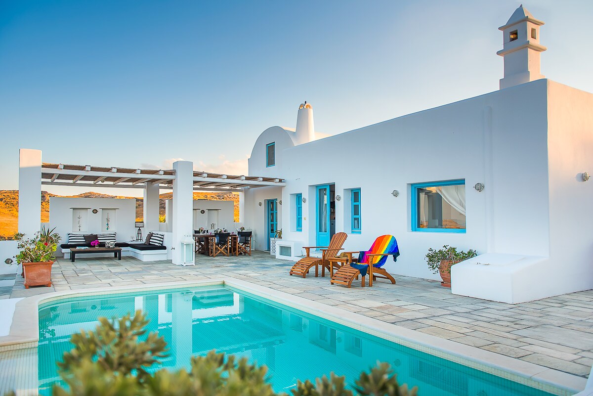 Poised on a hillside surveying the topaz Aegean Sea, Tramountana is an architecturally inspiring traditional Greek villa that looks as if it could have been fashioned out of snow. Generous outdoor areas and a high-quality interior finish lend it an air of laid-back luxury, blessed by breathtaking sea views. A separate entrance shields it from the road and there’s enclosed parking if you travel by car. Your accommodation includes complimentary car rental, third party insurance and unlimited mileage as well as transfers to and from the airport. Stepping inside Tramountana, you’re immediately struck by its uncluttered simplicity. Modern furnishings are offset by some older pieces and the décor is tastefully subtle. The main entrance leads to a bright and spacious open-plan living and dining area. Comfortably cushioned sofas invite you to take a break from the sun and choose from a selection of movies and music. A flat-screen TV, DVD player, sound system and high-speed wireless internet access makes it easy to stay in touch with the world. If you’d rather switch off, a picture window offers bewitching views of the ever-changing ocean. Fix yourself a cool drink or snack in the fully equipped kitchen and step out onto the pool terrace. Outside, a sculpted infinity pool mirrors the sea beyond and you can spend many hours just drifting and dreaming. Curvaceous sun loungers beckon you to take your place in the sun and an outdoor jetted tub promises to massage the tension from your shoulders. A well-stocked garden borders the villa and you are invited to help yourself to herbs and seasonal vegetables. Welcome shade can be found under the pergola, where you can cluster with friends for a leisurely lunch or tasty evening barbecue before retiring to the outdoor lounge for a nightcap. A second dining area at the other end of the terrace offers opportunities for more romantic dinners under the stars. Three air-conditioned, simply furnished bedrooms are brightened by vibrant bedspreads and prints. Bedrooms one and two are both en-suite and are positioned on the ground floor with access to a private terrace, while a third bedroom occupies the loft. Mosaic-tiled modern bathrooms with tubs and showers complete the ensemble. Massage treatments, yoga sessions and beauty care can all be provided at extra cost, and if you’re tempted to explore the locality you’re within walking distance of the beach, shops and nearest town. It’s 10km to the airport. Copyright © Luxury Retreats. All rights reserved. BEDROOM & BATHROOM Family Suite Bedroom 1: King size bed, Ensuite bathroom with stand alone shower, Safe, Desk, Bedroom 2: Queen size bed, Ensuite bathroom with stand alone shower, Safe, Desk, Terrace Loft Bedroom 3 - located above bedroom 2 : Double bed, Accces to ensuite bathroom in bedroom 2 FEATURES & AMENITIES • More under “What this place offers” below Included: • Bottle of Santorini wine on arrival • Complimentary 3rd party insurance & unlimited kilometers • More under “What this place offers” below At Extra Cost – advance notice may be required: • Activities and excursions • Theme dinner nights • Event fee • Mobile phone rental • More under “Add-on services” below