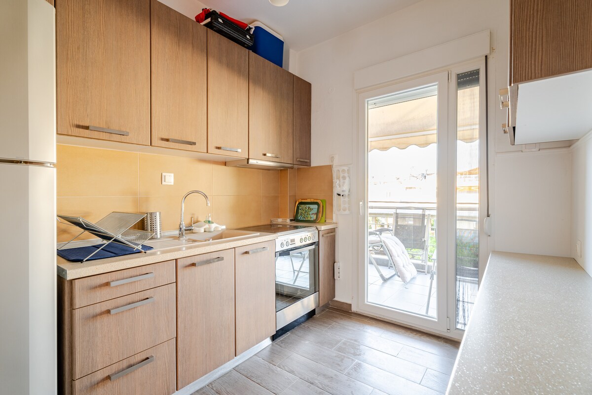 This beachfront apartment features a spacious balcony with beautiful views of Thermaikos Bay and Thessaloniki. It includes a large, cozy living room with a sofa that converts into a double bed, as well as a kitchen with an additional sofa. The small yet comfortable bathroom has a shower and a tap for everyday needs. The kitchen is equipped with a mini oven and complimentary laundry facilities. Additionally, there is unlimited 300 mbps Wi-Fi. The apartment has been fully renovated.