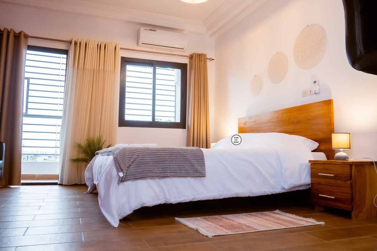 Notre logement de type mezzanine au carde somptieux et apaisant dispose d'une belle terrasse aménagé en petit espace de vie la cuisine est de style européen moderne équipés d’appareils électro ménagers la décoration du salon est fortement enrichie de plusieurs détails de touches de luxe et de classicisme et de modernité en plus d’être spacieux. plus haut, dans la chambre , un atmosphère luxueux et reposant doté d’un grand lit (3p) et de couvertures soyeuse pour des nuits merveilleuses