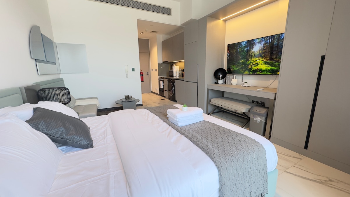 Experience the perfect blend of comfort and luxury in our spacious 45 sqm studio apartment. Featuring a plush king bed, a fully equipped kitchen, and a private balcony with stunning Dubai skyline views, this space is designed for relaxation. Enjoy modern amenities and hotel-like services, all within the warmth of a home-like environment for a truly memorable stay!