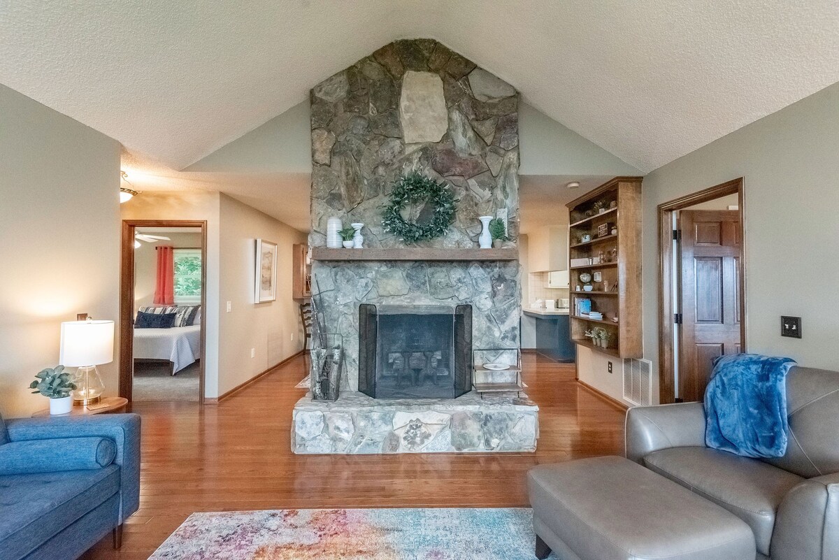Government ID requirement must be sent on the message thread Apartment with private driveway, parking, and ground level entrance. Living Room: Couch, workspace, television, fireplace. Kitchen: Fridge, stove, table, microwave, toaster, snacks, keurig, utensils, dishes, pans and kitchen sink. Bedroom One: King size bed, dresser, closet,TV, access to bathroom,patio Washer and Dryer Bedroom Two: Queen size bed, closet, dresser, access to bathroom. Outdoor: table and chairs, fire pit, grill