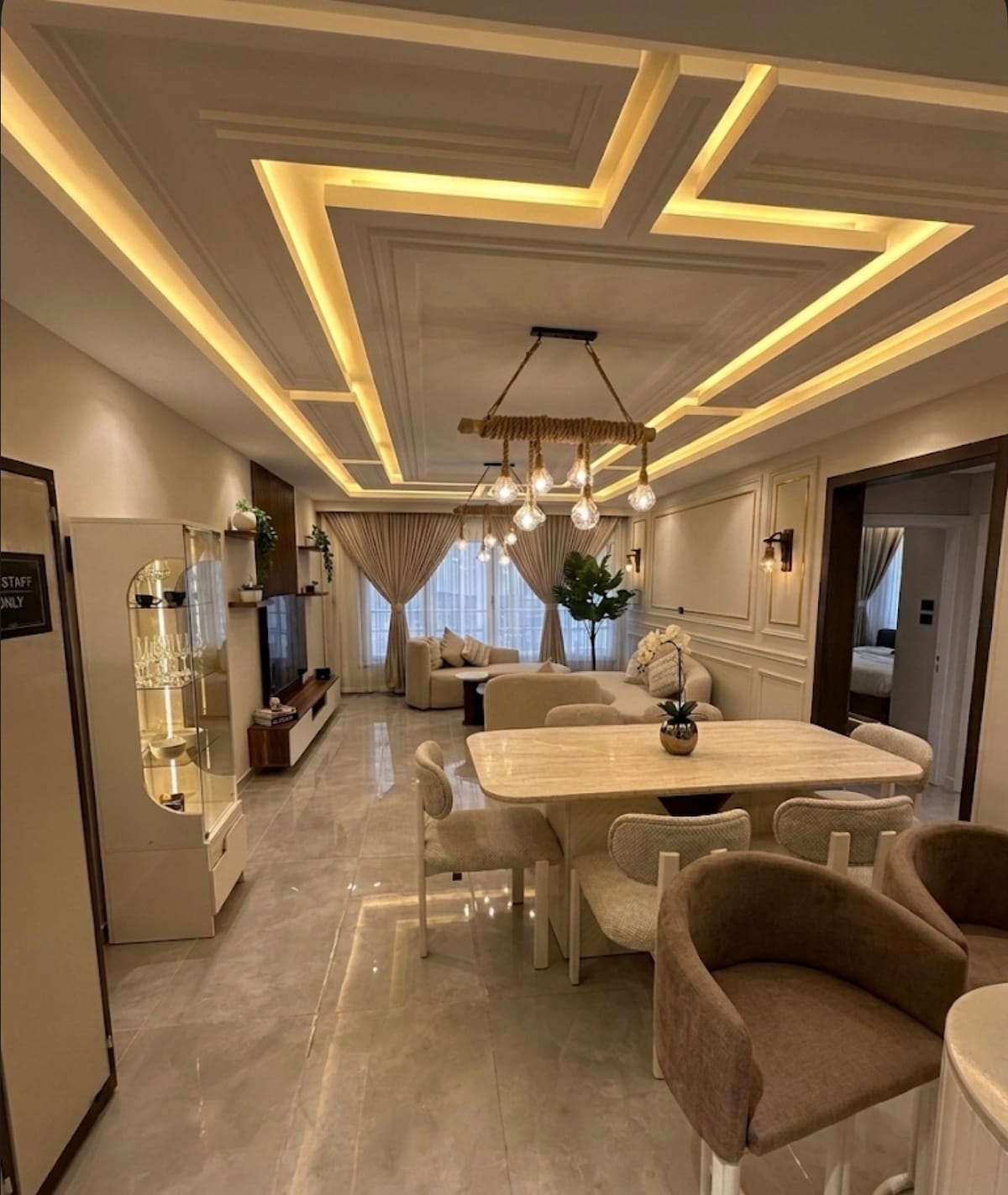 This luxurious apartment is designed in a modern and elegant style with wooden finishes in every corner, providing comfortable furniture and picturesque lighting that comforts the eye and heart. It includes 3 bedrooms, a spacious living room with a comfortable corner, a 65-inch smart TV and a hanging library with stunning decorations and wooden binding, a fully equipped kitchen, two bathrooms, and a large balcony with a charming view of the Mediterranean Sea, for an exceptional stay experience that combines comfort, luxury and beauty.