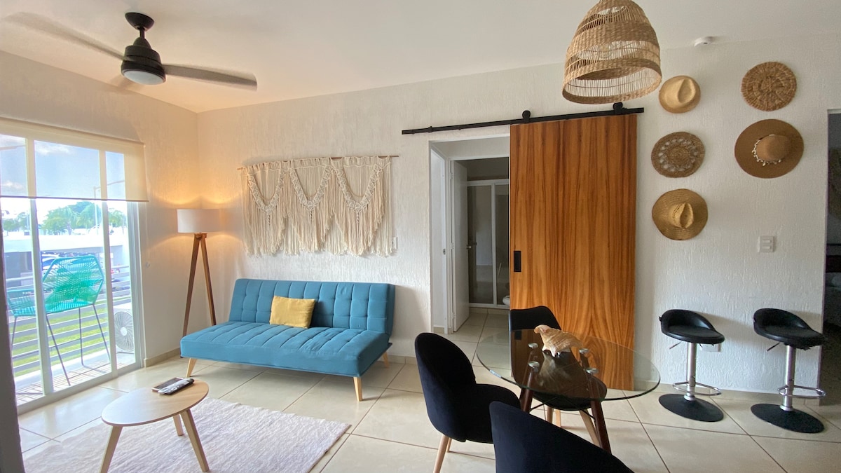Beautiful new apartment, super comfortable and modern with a pool and excellent family amenities within a gated community with 24/7 security, just 20 minutes from the airport and the best beaches in the Mexican Caribbean. Supermarkets, pharmacies and self-service stores at 5 min. Come to rest without worries! It includes: Wifi 2 rooms with queen size bed and air conditioners 1 sofa bed Living room with air conditioning 1 full bathroom Kitchen fully equiped Laundry center Beach towels