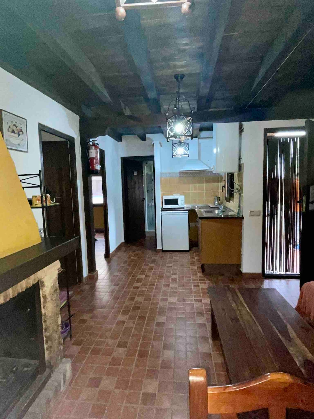 It has a living-dining room with a fireplace, TV, 2 bedrooms with double beds, an equipped kitchen (microwave, fridge, etc.), a bathroom, and a terrace with a porch and barbecue. It is glazed. It has heating, bed linens, towels and kitchenware. From there you can go to the source of the Mundo River by a hiking trail without taking the car, which is very nice by the way.