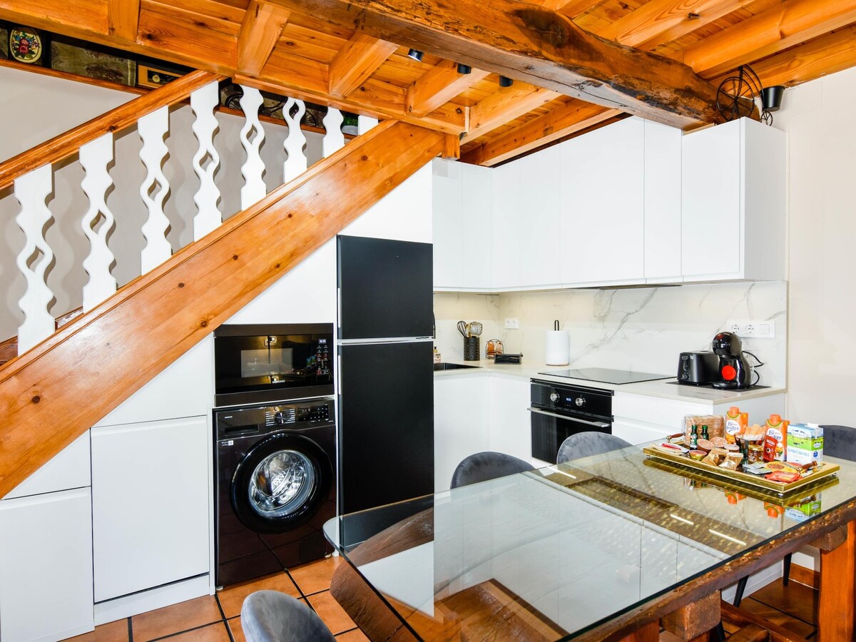 A 75 m2 house distributed over three levels and featuring a separate kitchen, a dining room, a living room with a fireplace, and two bedrooms with an en-suite bathroom. It is an old building that has been completely renovated and equipped with a ceramic stovetop, oven, microwave, washing machine, dishwasher, refrigerator, small appliances, dishes, bed linens, and towels. It has a closed patio with access from the kitchen to relax or eat outside and a balcony overlooking the street.