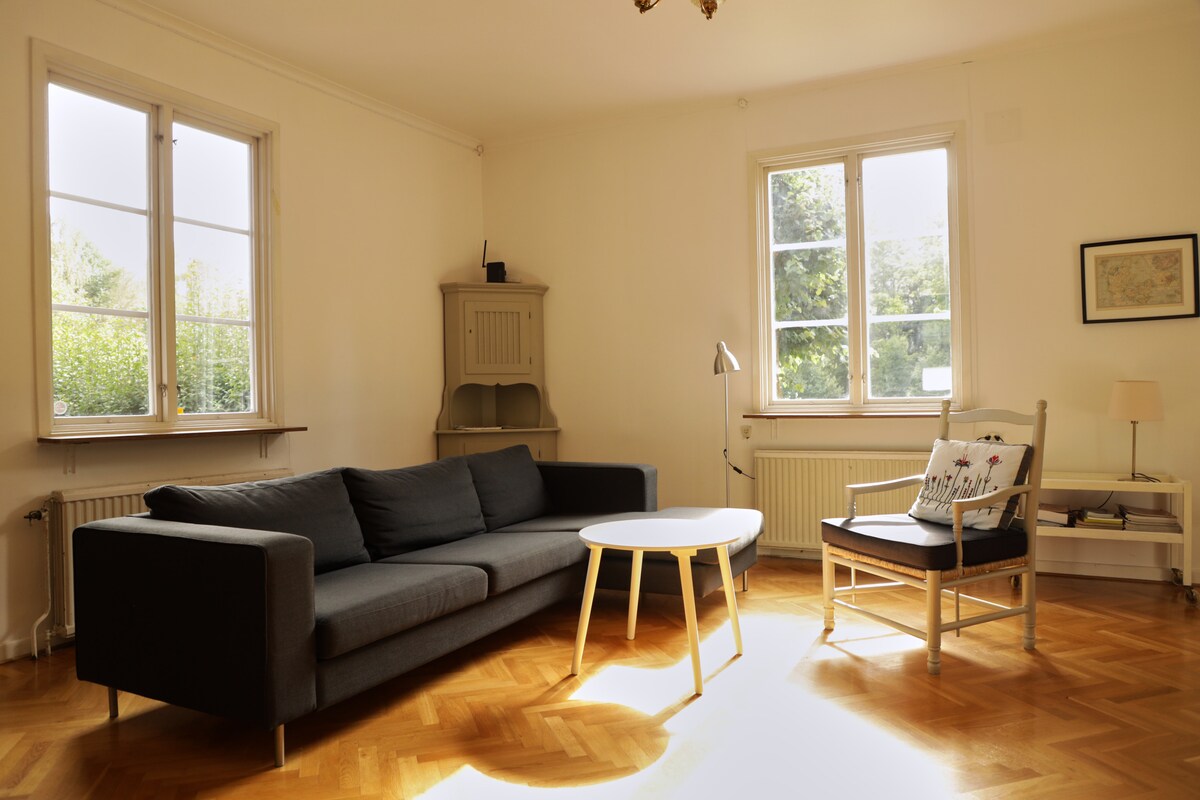 Charming little cottage that is newly renovated to a high standard. 1200 meters from the train station and 300 meters from green area with exercise loop. The bedroom has A/C, a 140 cm bed, TV and WiFi. Fully-equipped kitchen with induction, microwave, oven and floor heating. The bathroom has a washing machine with built-in dryer, toilet, sink and shower and underfloor heating. The house is pet-free and smoke-free.