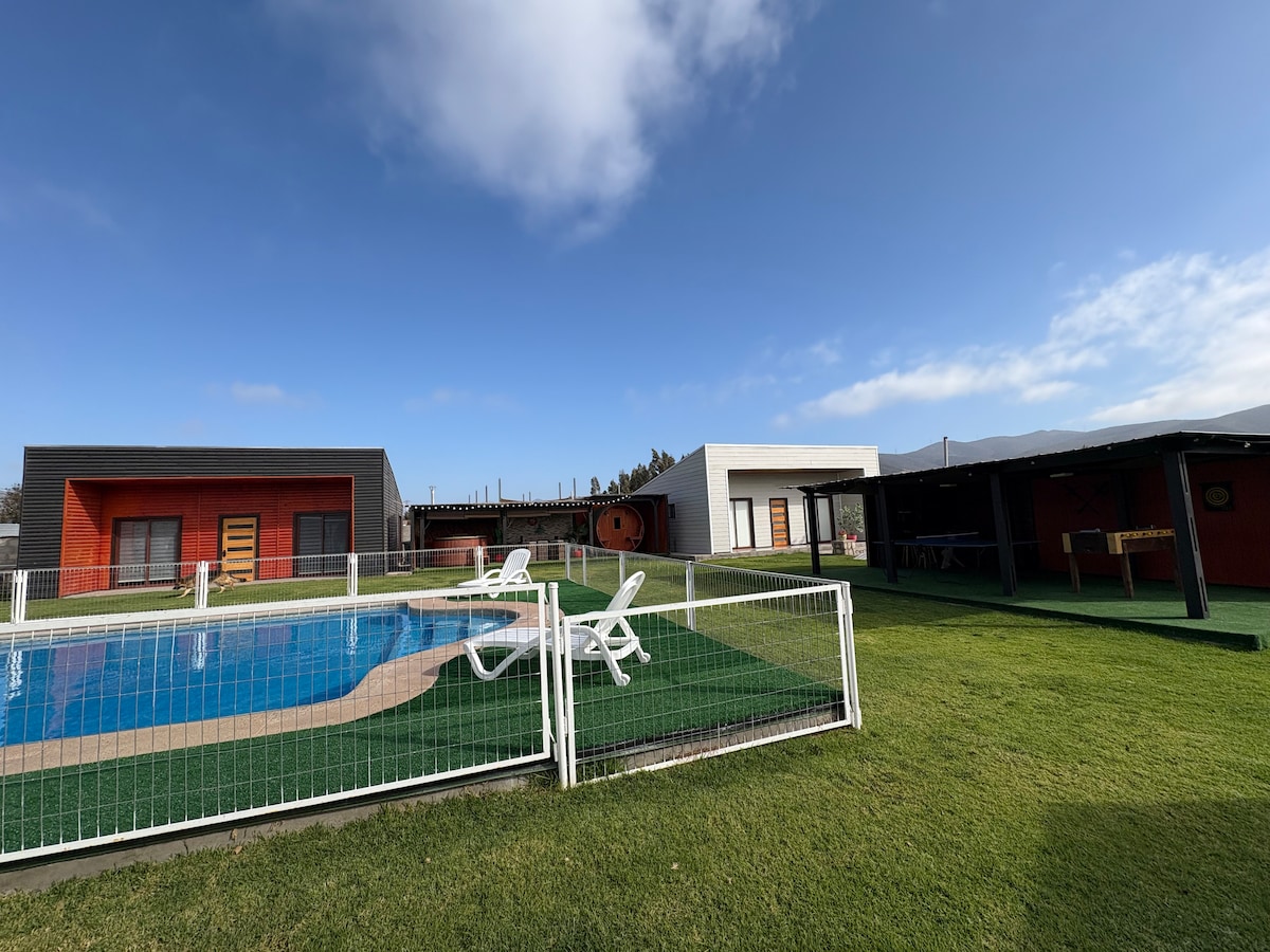 Relax with the whole family at this peaceful place to stay. It has access to swimming pools, a gazebo, and we also offer a hot tub service 13 km from La Serena, with quick access to Route 41, 1 km from the water park and 5 km from the airport and supermarkets. Cabin with three bedrooms, equipped with kitchen, bathroom, living room, dining room and green areas for relaxation.