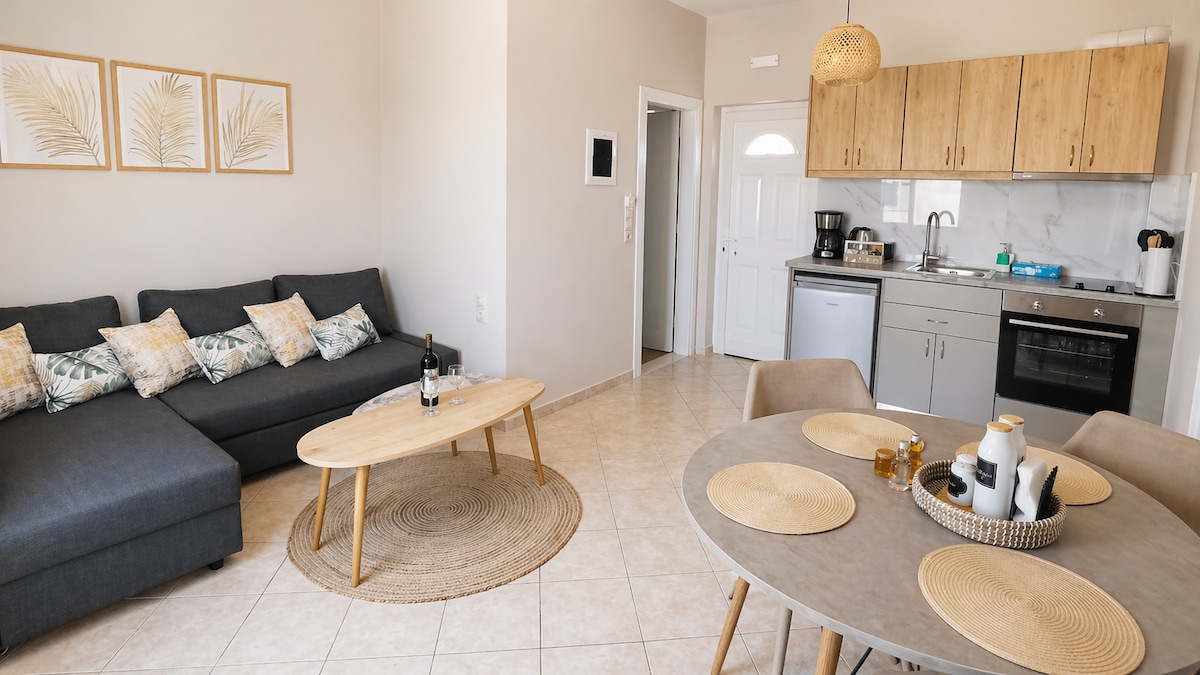 Bask by the Beach in a Chic Apartment Overlooking the Sea. Enjoy breathtaking sunsets from this modern apartment just steps away from Ammoudara beach. Start your day with a swim or relax on the balcony with a sea view. Traditional Cretan lace and artwork add a touch of folklore to the stylish interior. The house is fully equipped with everything you need, including a kitchen and modern amenities like Wi-Fi, air conditioning, and a TV. Take a short drive og 10 minutes to Heraklion city center.