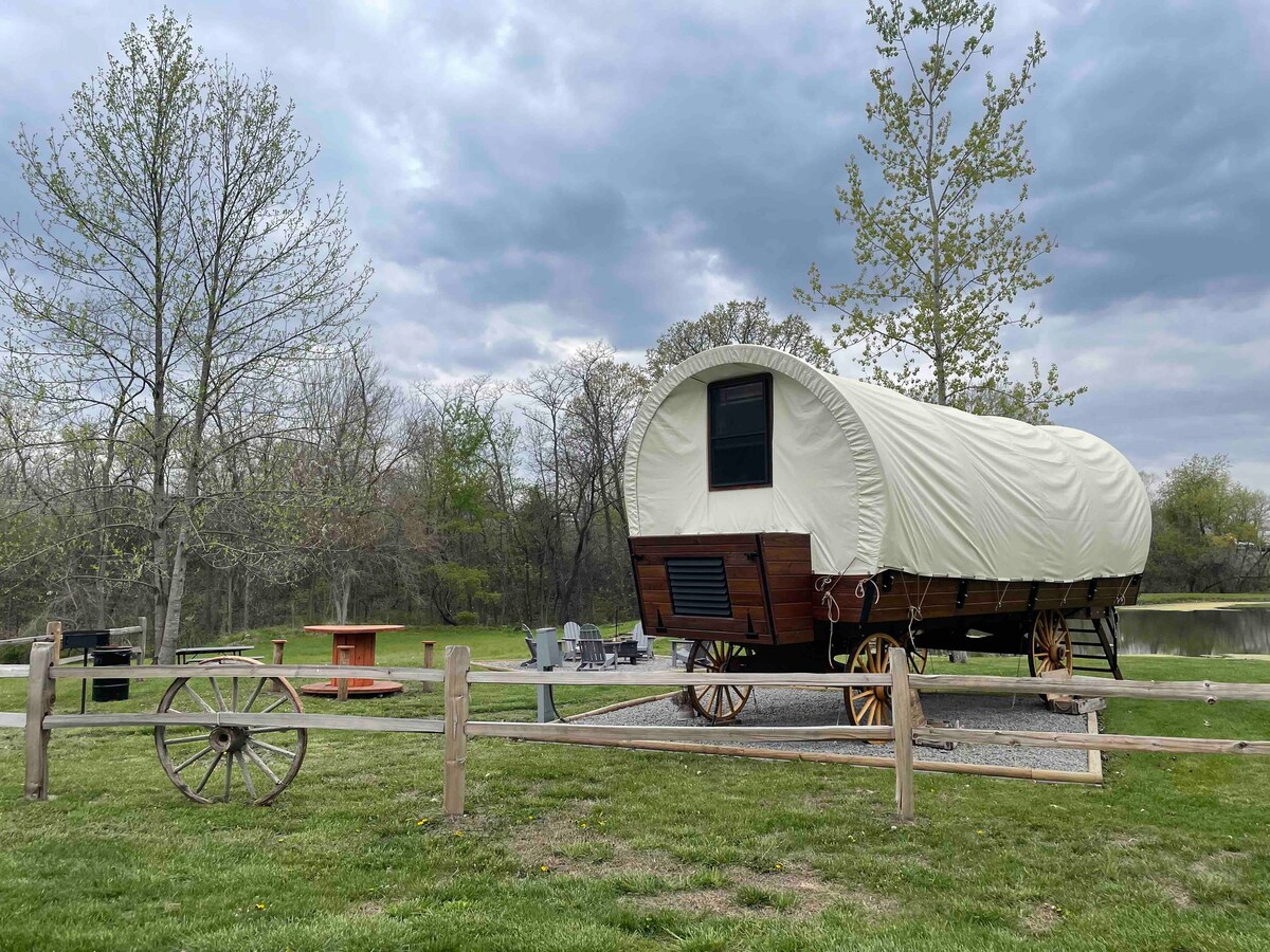 Are you ready to dive into the Western world of St. Joseph? Are you looking for a unique glamping experience that takes your adventure to the next level? Book today the covered western trail wagon and have your once-in-a-lifetime experience! The fully insulated wagon fits a max. of 6 people. It is equipped with a queen bed, 2x twin bunk beds, A/C & Heater, fridge, Wifi, TV and more. The outside ambient offers a fire place with chairs and a swivel campfire grill for bbq and cooking.