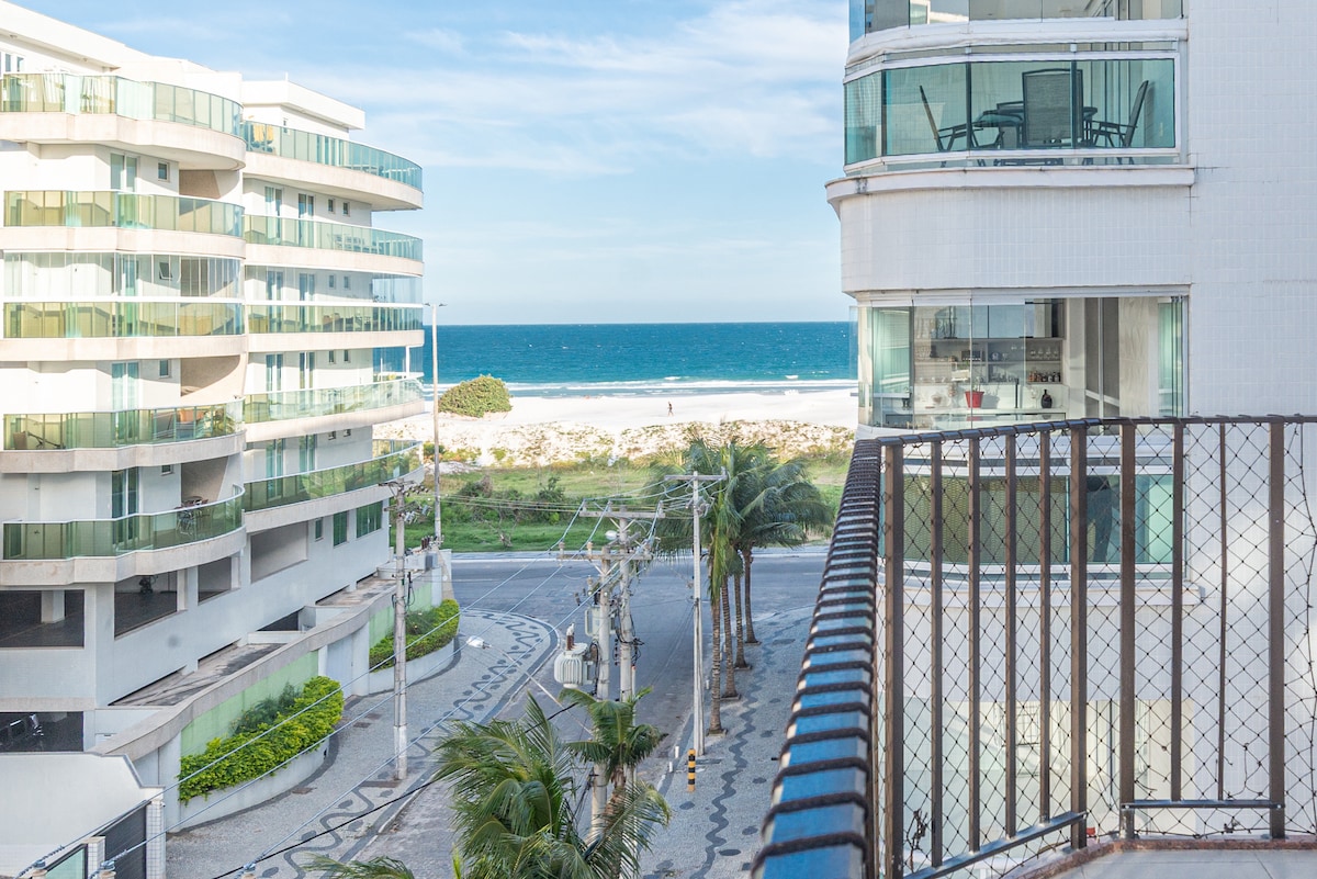 Spacious beachfront apartment in Cabo Frio. It's a three-bedroom, including a master suite, a fully equipped kitchen, and a living room with a balcony offering an ocean view. It's perfect for enjoying with family! Air conditioning in all bedrooms. The apartment is situated between Praia do Forte and Praia das Dunas and has a balcony with an ocean view. Just a few steps from the apartment, you will find cafes, restaurants, ice cream shops, and a pharmacy.