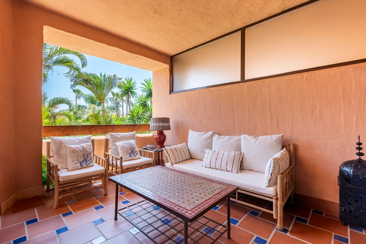 Cozy 120 m2 apartment, ground floor, 2 bedrooms and with individual garden and exit to large community gardens, located in a luxury development with 5 swimming pools, one of them heated in winter, 24 hour security, tennis and paddle courts. Located on the new Golden Mile of the Costa del Sol, next to golf courses (Guadalmina, Atalaya), 5 minutes walk from the beach, 5 minutes drive to Puerto Banús and Benahavis and 10 minutes from Marbella and Estepona.