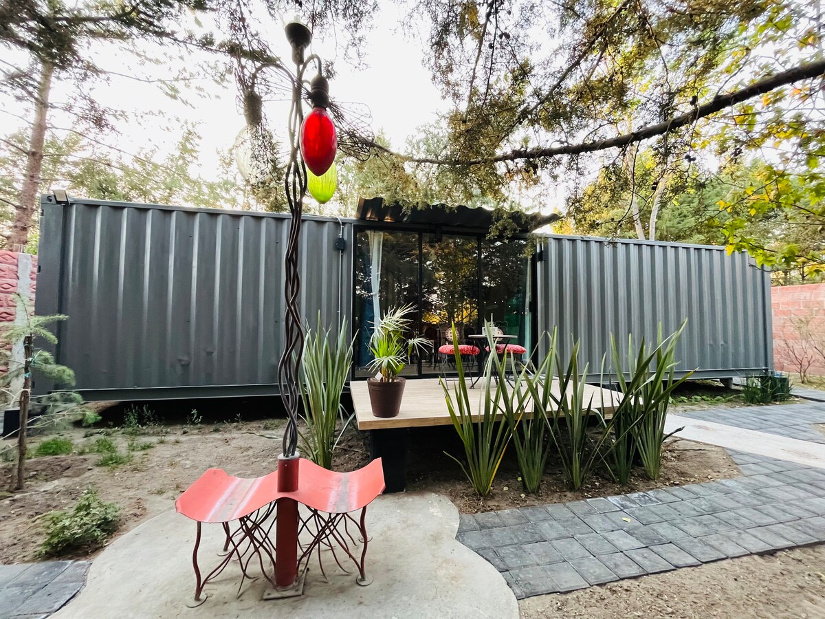 Nuestro moderno contenedor está diseñado para dos huéspedes y ofrece un ambiente minimalista confortable. Todas las mascotas son bienvenidas! Nuestro contenedor está estratégicamente situado a unos 20 minutos de la montaña La Malinche, a lado de la famosa Hacienda Soltepec y club de golf. Te mereces un break de la ciudad, ven a descansar en el bosque! Reserve hoy su retiro a la montaña y sumérjase en la impresionante belleza de Soltepec, Huamantla, y Tlaxcala. ¡ Estamos encantados de recibirte!