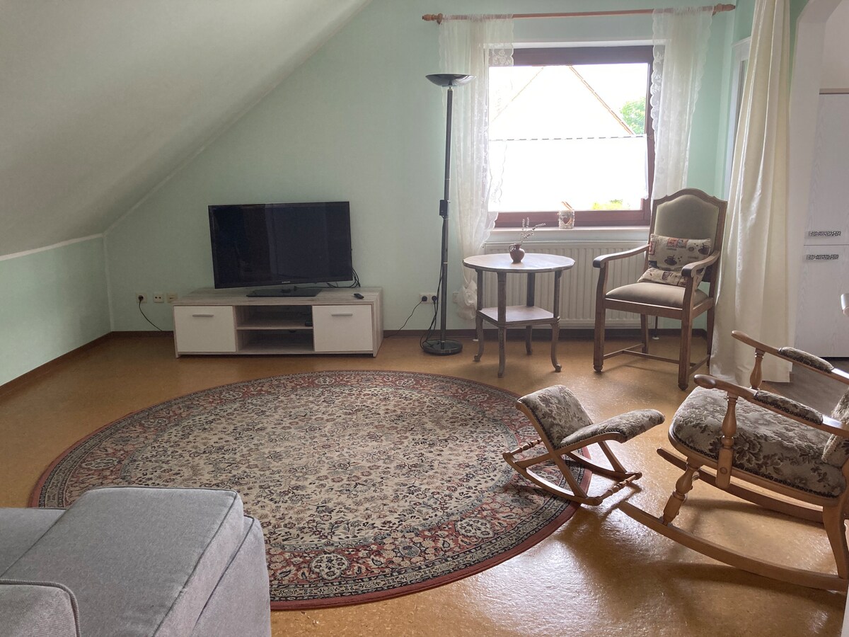 Our vacation apartment is located in the attic of our bungalow. It consists of a room with a living area, a sleeping area and a kitchenette. In addition, there is the bathroom. (One-room apartment) You can reach it through the main entrance door of our house via the common hallway and the stairs up, via our gallery. Only our guests live on the upper floor, it is also lockable with a separate key. The house is situated in a quiet residential estate.