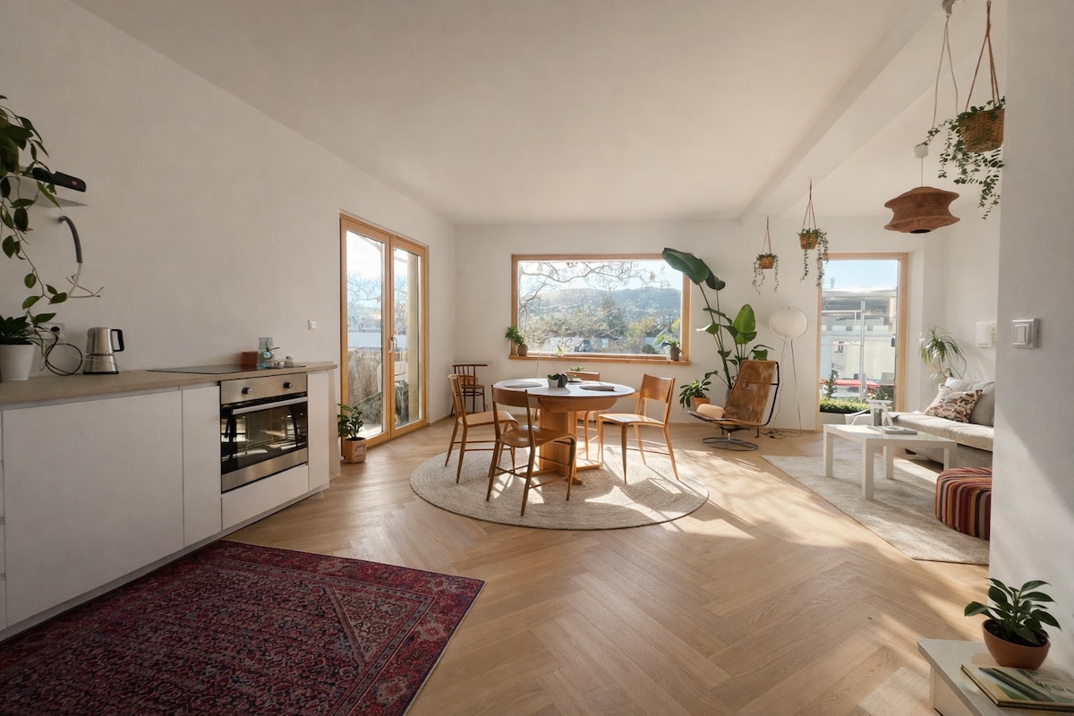 This apartment is the ideal place for a relaxing stay in close contact with nature. The loft is located in the roof-top of an ancient house in a green residential area just outside Vienna. Its large windows looking into the green and the interior made of ancient wood grant a unique relaxing feeling. Waking up in the morning to look out that large window into the garden is simply priceless. The spacious terrace is perfect to enjoy the sunny days not only in summer but also in spring and autumn.