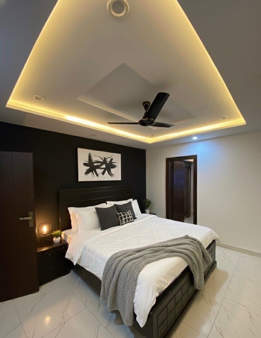Luxury 1-Bed Apartment | Eiffel View | Staysia Rooms 1 - Eiffel View Balcony for morning coffee 2 - Queen Bed with Floating Lights 3 - 2 Smart LCDs (55â in bedroom) + Netflix 4 - 2 ACs (1 free, 1 optional +PKR 2000) 5 - High-Speed Wi-Fi, peaceful ambiance 6 - Dining for 4, plates & cutlery 7 - Self Check-in/out + Welcome Basket 8 - No parties, drugs, alcohol, or loud music 9 - Stylish dĂŠcor & professional hospitality 10- Comfortable, cozy and Spacious