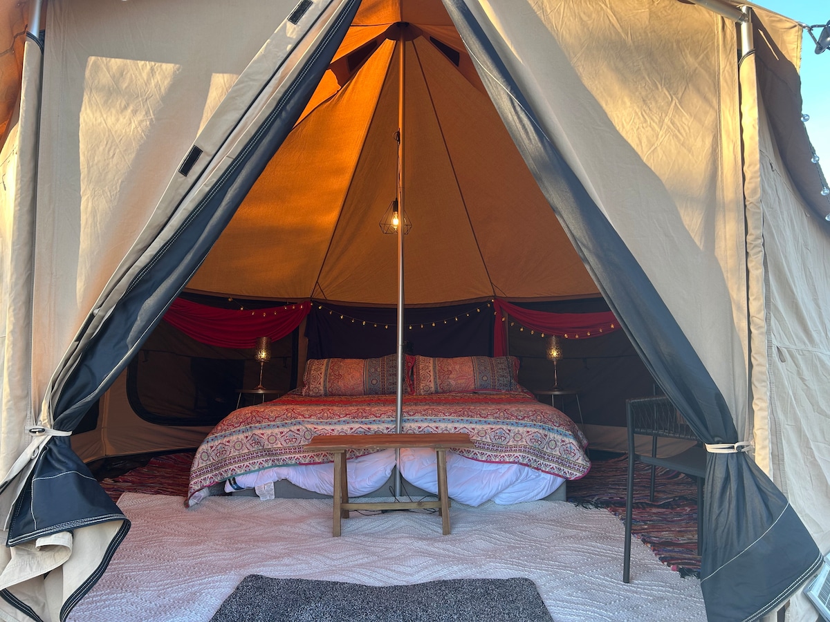 Glamping Súper offers 4 full size beds in a spacious Safari tent. It offers guests a unique opportunity to connect with nature & disconnect from the city life. Glamping brings the outdoors to you with the amenities that will enhance your camping experience. Your accommodation is equipped with all that you will need to enjoy Glamping! Your private jacuzzi is available for unlimited use during your stay for an additional charge.