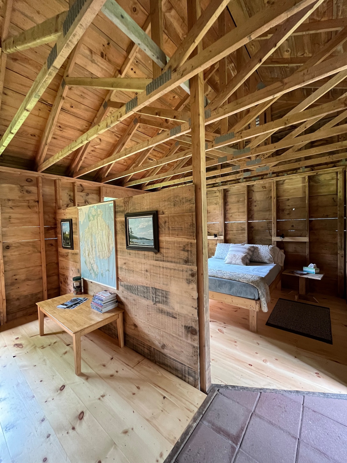 Tranquil cabin; open plan. Bedroom w/queen bed & privacy doors. Alcove w/bunkbeds. The Cabins at Currier Landing, featured in Dwell as “Three Magical Tiny Cabins Take Root in a Maine Forest,” are located on the Thos. Currier Saltwater Farm. Glimpses of water & access to 300’ of the Benjamin River Harbor shore. 2 seasonal cabins; 1 studio cabin. Centrally located on the Blue Hill Peninsula near Deer Isle, the cabins offer access to outdoor activities, cultural events, restaurants & shops.