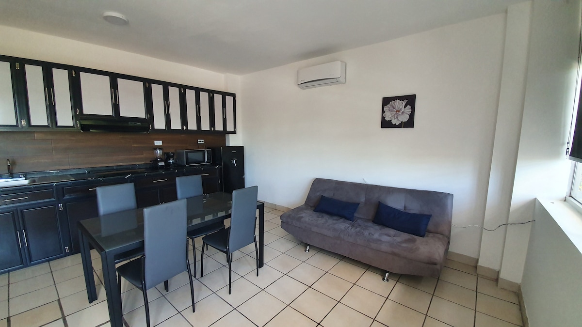 This elegant apartment is inside a spacious and modern house, it is ideal for family trips, events and business, it is located on the second floor, it includes: - King size bed (2 people) - Sofa bed 1 - Exclusive bathroom - Kitchenette - Coffee maker, microwave (supplies) -Smart TV - desk - A luggage rack - A dining room. GROUND FLOOR: - Lobby (common area) - Patio and garden - An event room (by reservation) - Parking (request availability) SECOND FLOOR: - Lobby - Kitchen - A laundry and ironing room