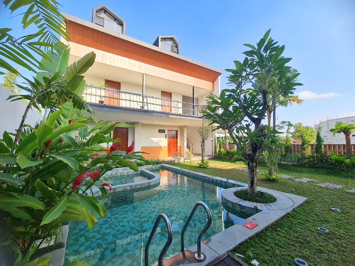 This villa is located in the popular Prawirotaman area—one of Yogyakarta’s favorite spots among international tourists. It features a private pool and a relaxing bathtub, offering a homey and comfortable stay. There’s also a kids activities area, making it perfect for family getaways. Surrounded by cafés, art galleries, and cultural attractions, it combines the best of vibrant local life and peaceful retreat.