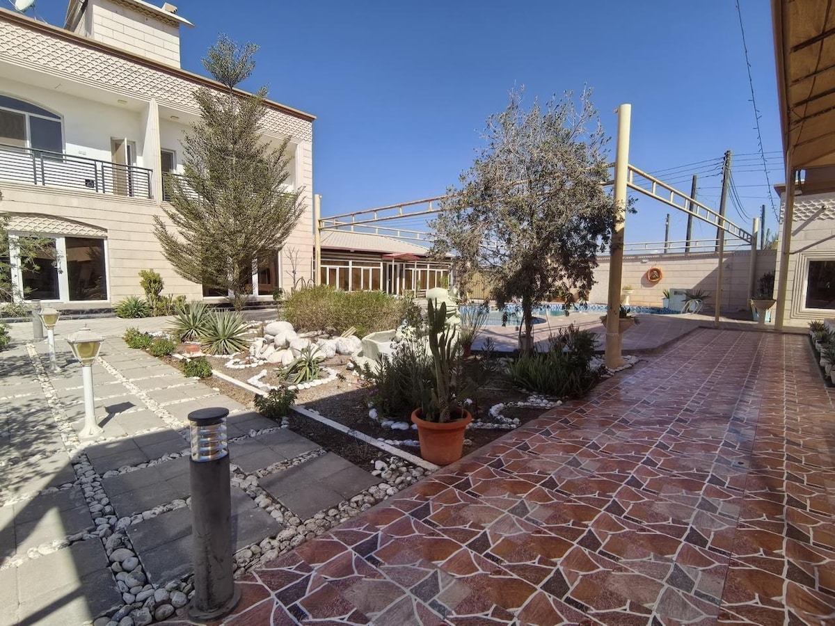 Enjoy peace and relaxation with your family in this quiet home. A swimming pool for adults and another for children with a jacuzzi in the main room Away from the hustle and bustle of the city, there is a 20-minute drive to the sea There is a worker who can help with everything. His entrance is far from the villa entrance