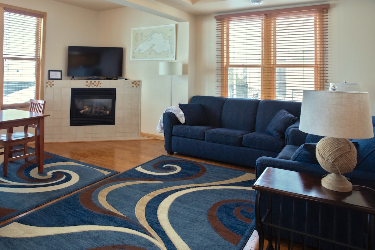 Bayfield Condo Rental - Boatworks #202 is a cozy 1 bedroom 1 bath condo 2nd floor property with elevator. 690 sq ft. Private off-street parking. Located across the street from Apostle Island Marina. Fully equipped kitchen, living room with fireplace, bedroom with queen size bed, full bath. Central air conditioning. Outdoor patio.