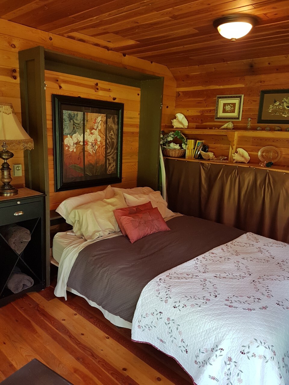 The Cozy Cabin offers a queen bed, twin bed, bunk bed, wood stove plus electric heat, ceiling fan, microwave, fridge, toaster oven, hot plate, Bell TV and Wi-Fi. We have a separate building a few steps away with a washroom, shower, and sauna. The Cozy Cabin offers many kitchen appliances, coffee maker, grill, electric fry pan, dishes plus many more misc, to make your stay more enjoyable.