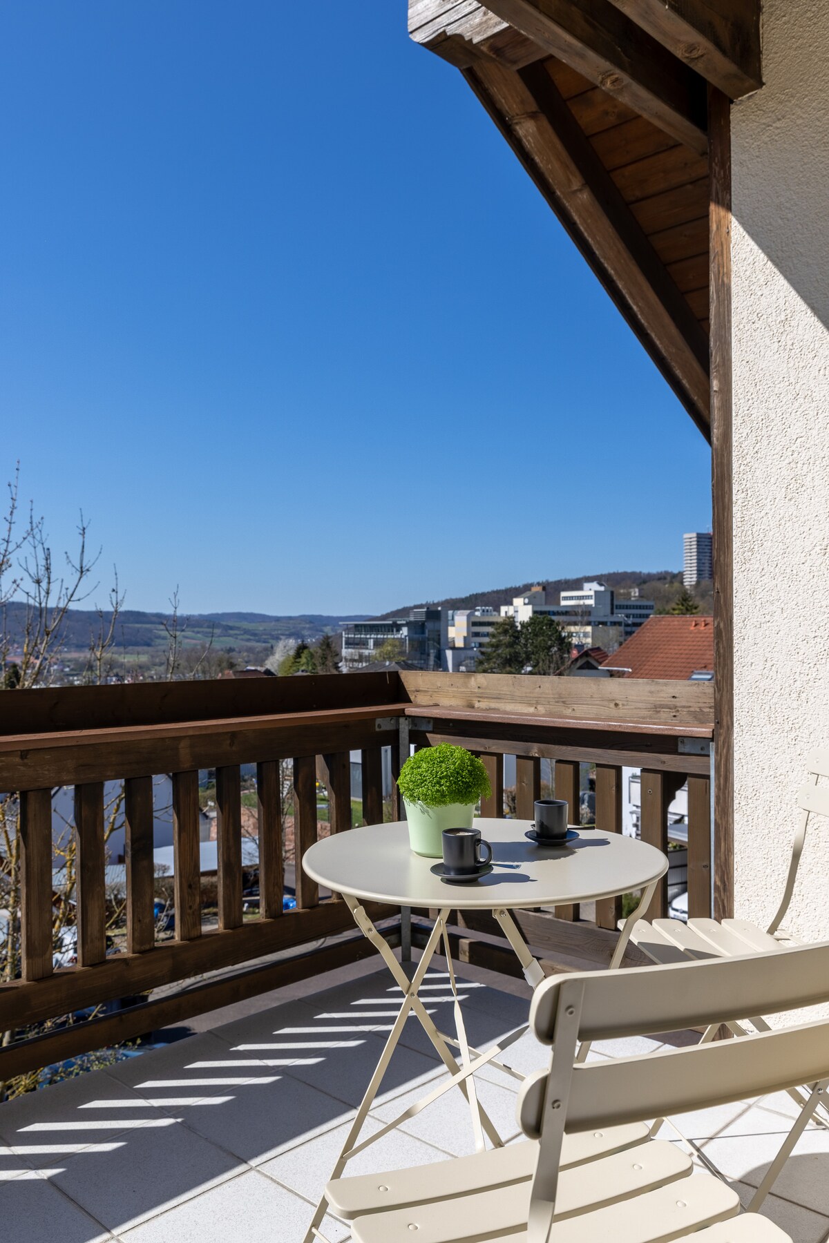 Dear potential guests, Whether in transit, for a little time out or for longer - our spacious, comfortable apartment Elli is quickly accessible and a good place to relax in the evening - e.g. on the balcony with a view. In the village, there is a nice outdoor pool and good gastronomy - around it a lot of forest. Our café serves breakfast weekdays from 6 AM and on weekends from 7 AM.