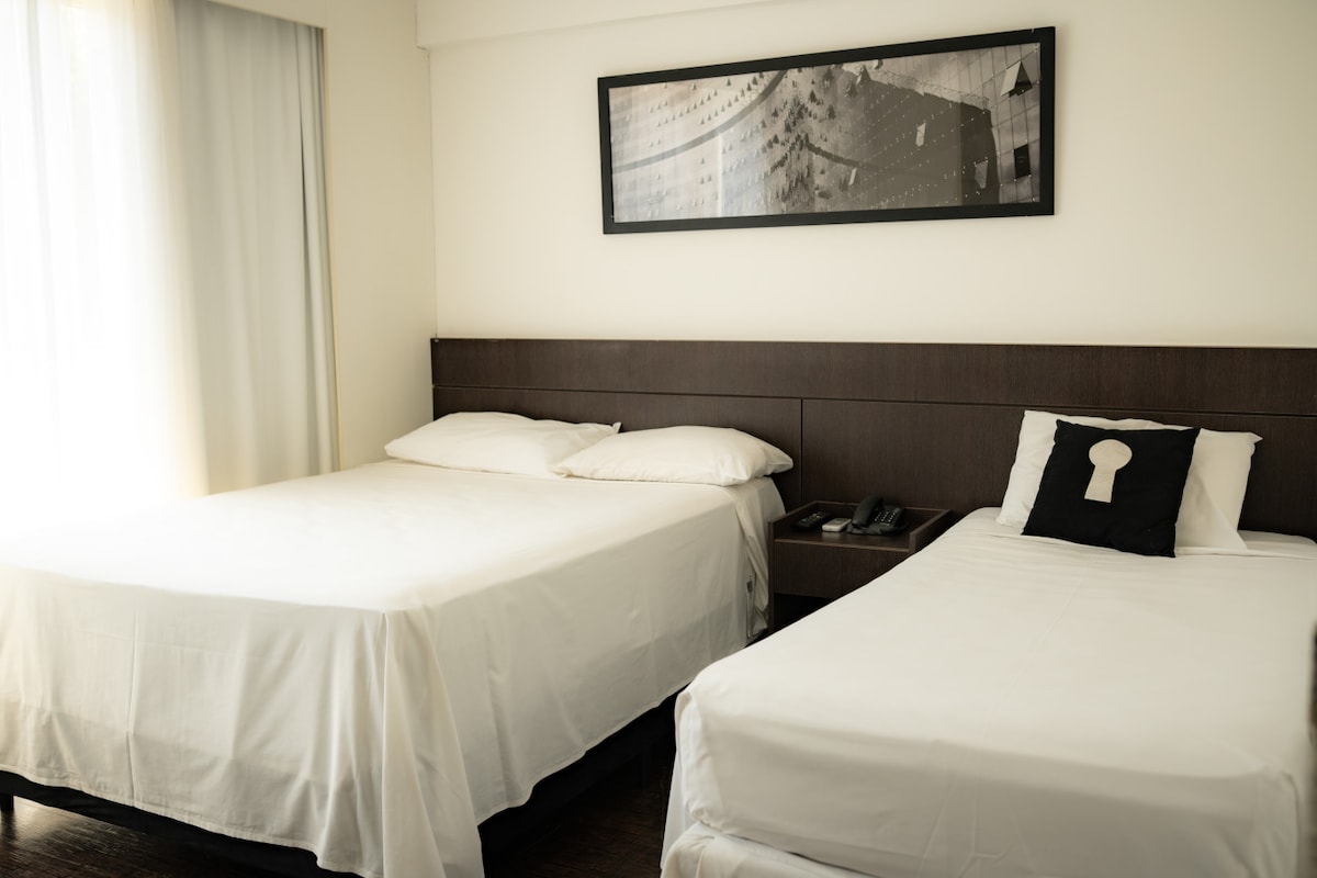 Flat Superior Plus Category - Luxury! Modern with unique designer. High floor with panoramic view to BH. Very privileged location, this luxury in Alto da Afonso Pena,is a highlight in the logistics of travel in BH, easily reaching the tourist and business points. Flat with air conditioning, 32"TV, work table, minibar, hair dryer, and safe. The structure of the place has a restaurant, fitness space,swimming pool, sauna, lobby bar, Wi-Fi, 24-hour Room Service and 8 event spaces.