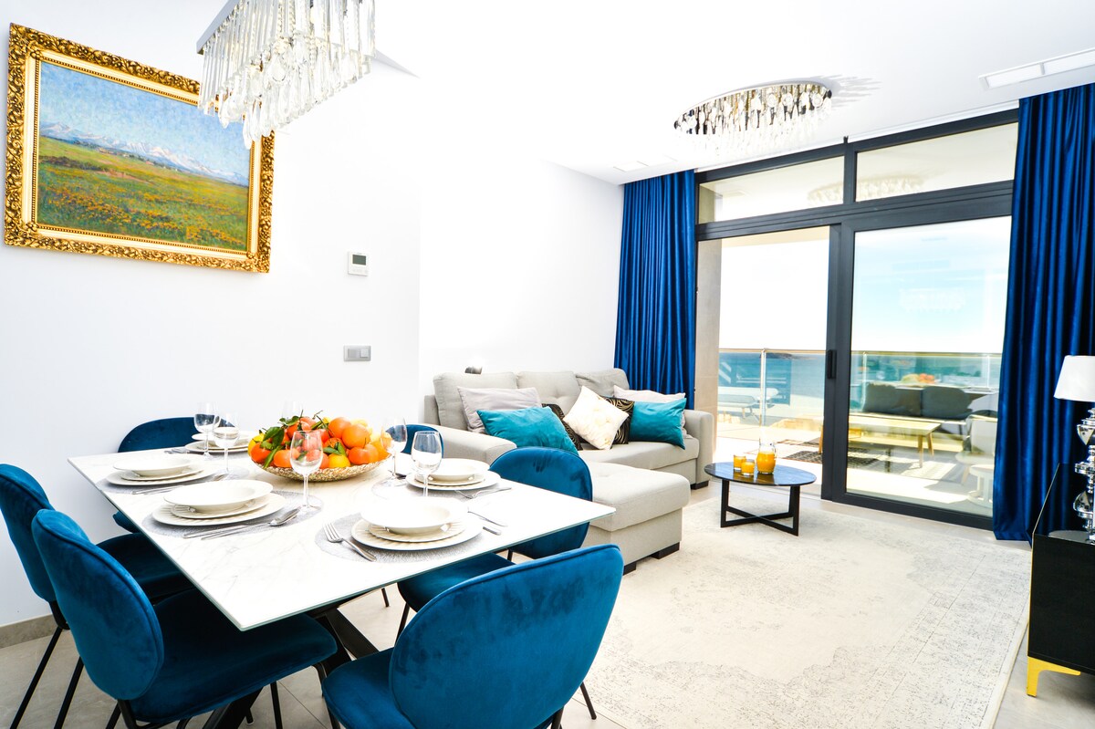 Welcome home! Your new 80 m² luxury apartment is located in an exclusive, quiet area of Benidorm, just 30 meters from the fantastic sandy, longest beach in Benidorm - Poniente beach. The location affords you a wonderful view of the sea, and there is a 200 sqm terrace with a pool. The tasteful and exclusive interior fittings and furnishings invite you to relax and enjoy every moment, completely undisturbed. There is a modern smart television in every room. And of course you have your own garage.