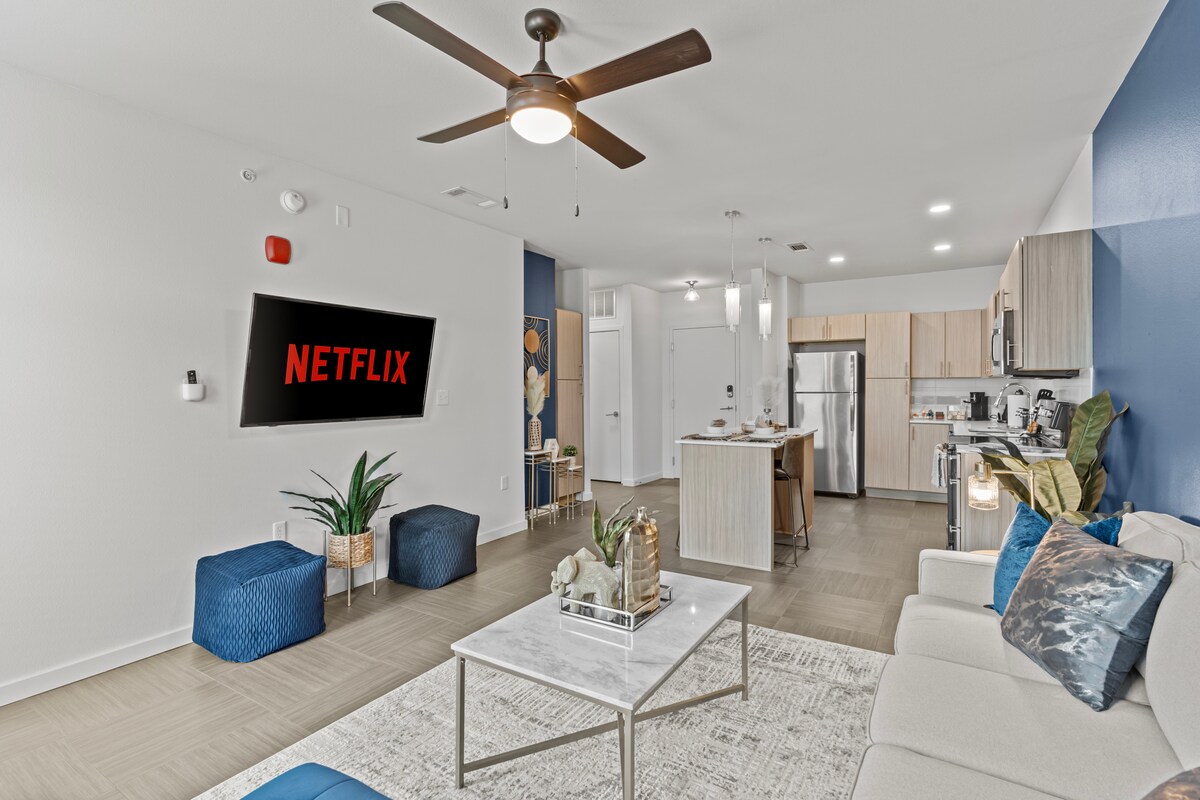 Experience upscale living in this stylish 1BR condo, perfectly located in Rogers, AR. With refined modern decor and an inviting ambiance, it’s steps away from the Walmart AMP, Top Golf, and numerous dining options. This home is an ideal base for exploring the local scene, shopping, and the Razorback Greenway. Whether for business or leisure, this deluxe retreat offers comfort and convenience at every turn.