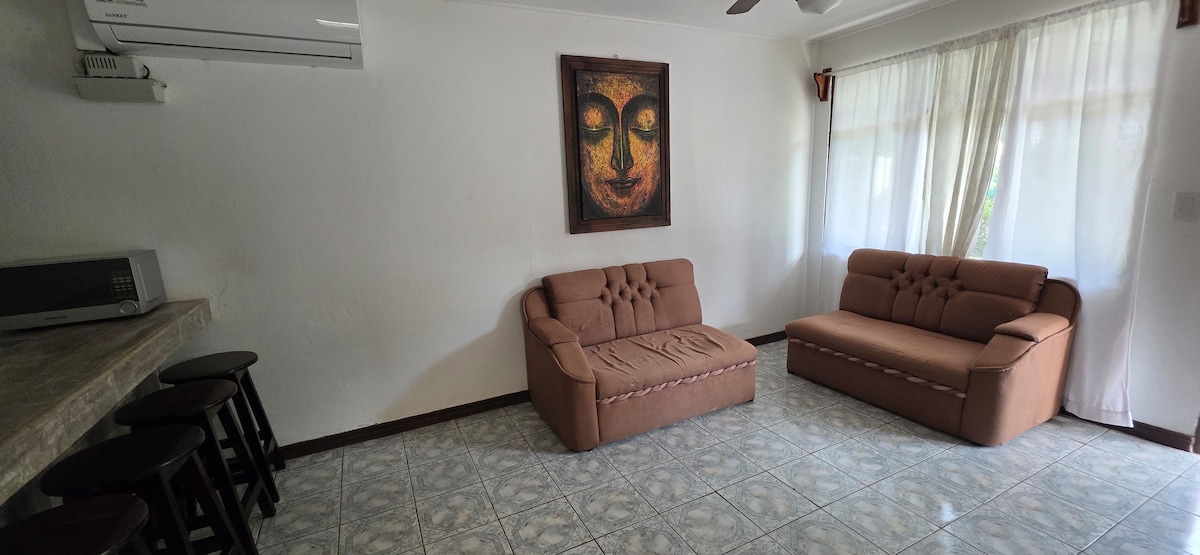 Recently renovated, wide open-flat (700 sf ca): sleeping/bathroom + kitchen/dining/living areas separated by two arched walls, wide terrace facing trees/beach. New king-size bed, furniture and appliances with hot shower. This space also includes AC, TV, WiFi, andgated parking. Ideal location just outside of the Manuel Antonio National Park and only 100mt to the beach and local shops, restaurants, markets.