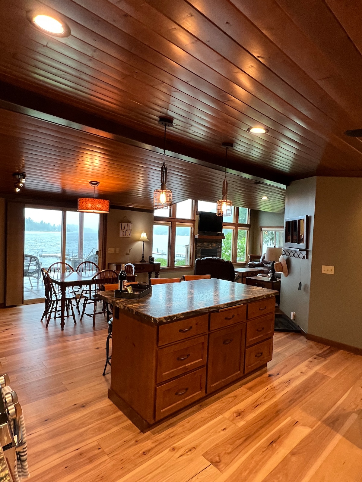 Escape to this private sanctuary, a hidden gem on the shores of a pristine lake. The cabin offers 2-bedrooms, plus additional sleeping in the 24ft yurt (unheated) and twin trundle beds upstairs. Living room with wall of glass doors opens to spacious deck. Cozy up by the gas fireplace or unwind in front of the TV. Kitchen provides space to cook and room for 6 to gather. In the open-air loft, you'll find a queen bed, walk-in closet, and 3/4 bath with tub. Park-like yard features dock and firepit.