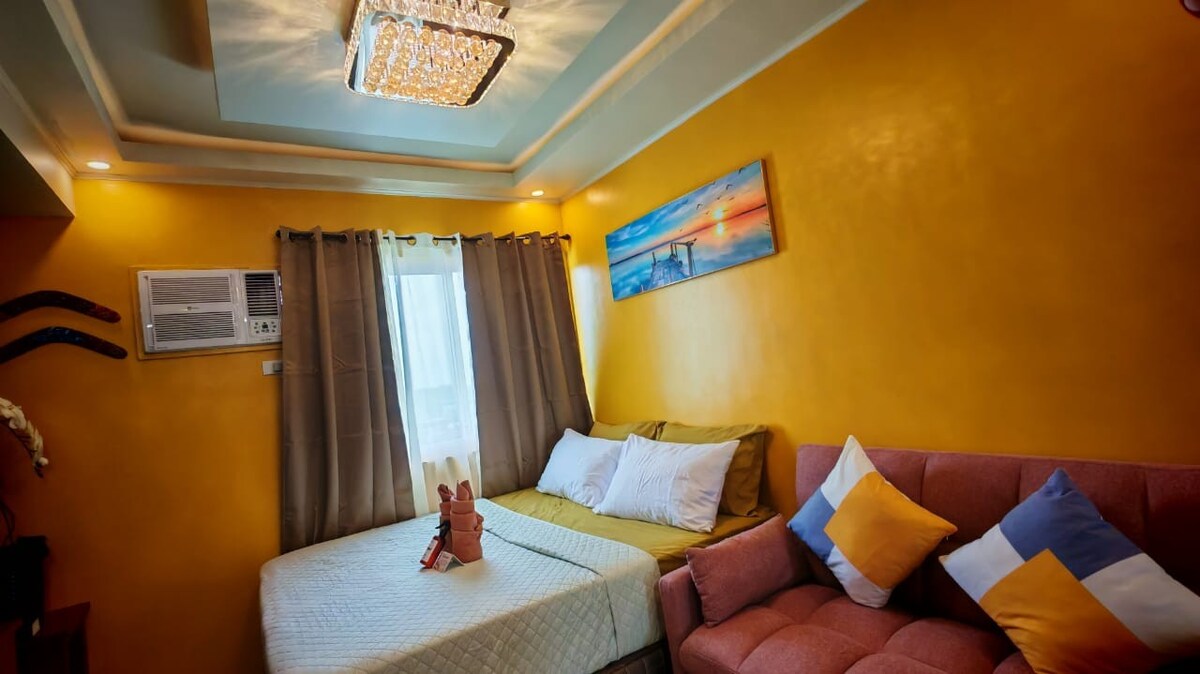 Stay in the center of the action in this one-of-a-kind place. Near to everything that you need. A very nice place to stay, hangout or just chill. * Aircondition * 65-inch TV * Soundbar Speakers w/ Subwoofer * WiFi * Air Purifier * Bed Size Double 54x75 * Pull-out Bed size twin KITCHEN * LG Refrigerator 7cuft. * Induction Cooker * Microwave Oven * Electric Kettle Pots & Pans * Kitchenwares & Utensils * Dinnerware BATHROOM * Single Point Water Heater * Fully Automatic Washing Machine