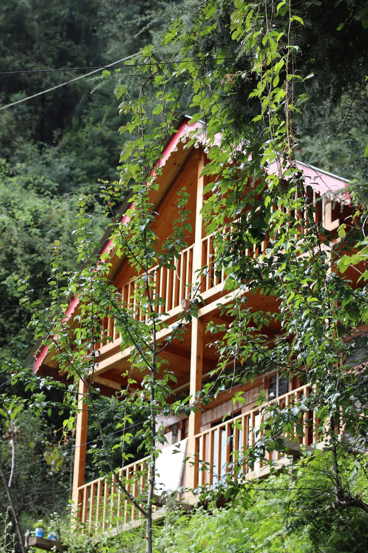 “Into the Woods Eco lodge in the middle of Apple orchards and forest with stunning views.” ★ Rustic Pinewood Architecture ★ Panoramic Views of Forests & Mountains ★ Eco-friendly Stay . ★ Wi-Fi ★ Power Backup ★ Fresh, Home-style organic Food ★ Bonfire Area ★ Indoor Fireplace & Dining Area ★ Organic Garden Surroundings Please note:- There is 500 meters trek down from parking spot to reach at property, Your luggage will be carried by us.