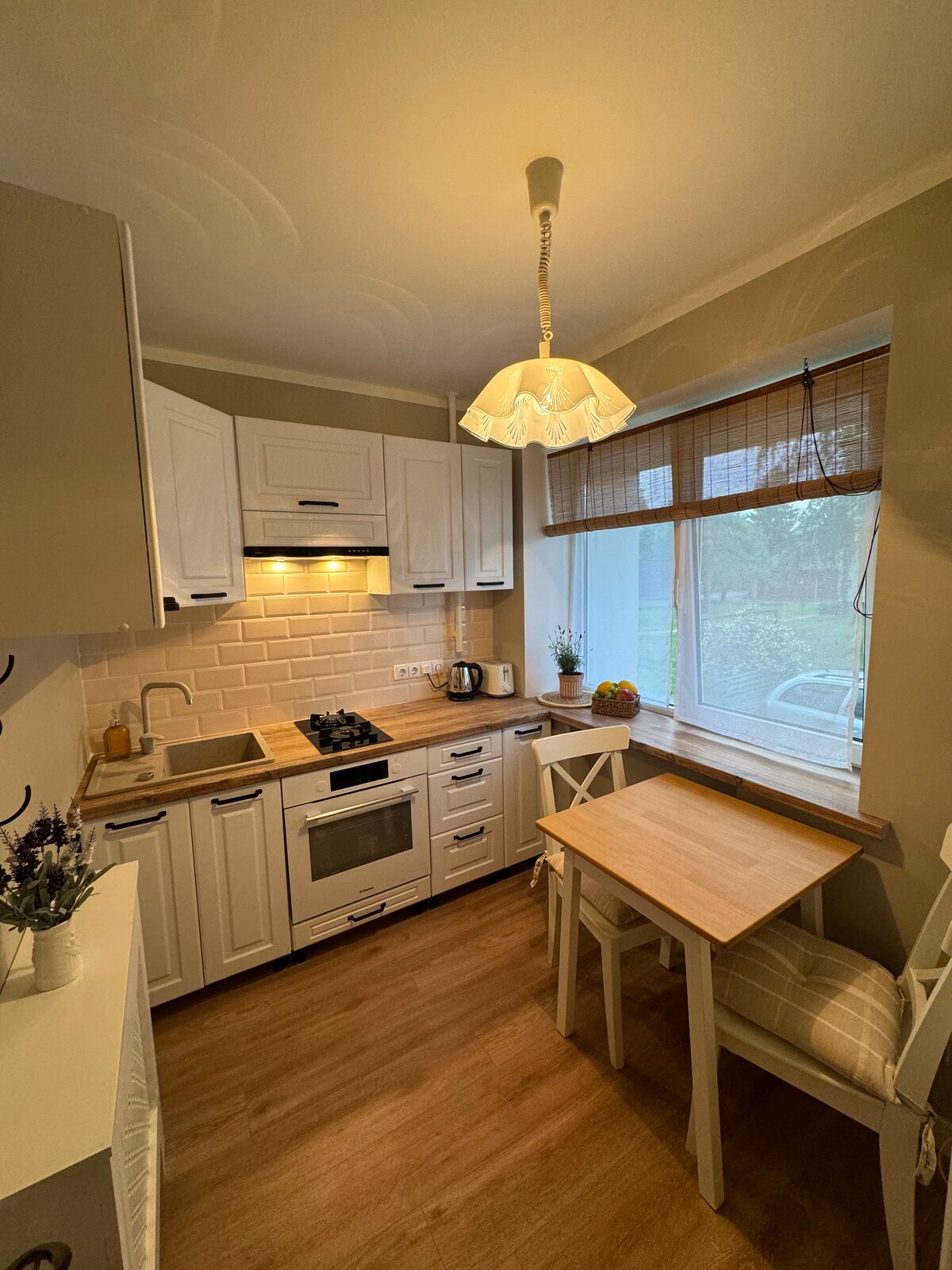 I am happy to present you with a newly renovated cozy apartment in the heart of Birzai. This 42 sq.m apartment on the first floor is perfect for traveling couples or a small family of four. Here you will find a nice bedroom with a double bed, a sofa bed in the living room, a fully equipped kitchen and a bathroom. Advantage - free parking space. A quiet and at the same time convenient place is located near a shopping center, a small local store, a coffee shop and a tourist attraction.