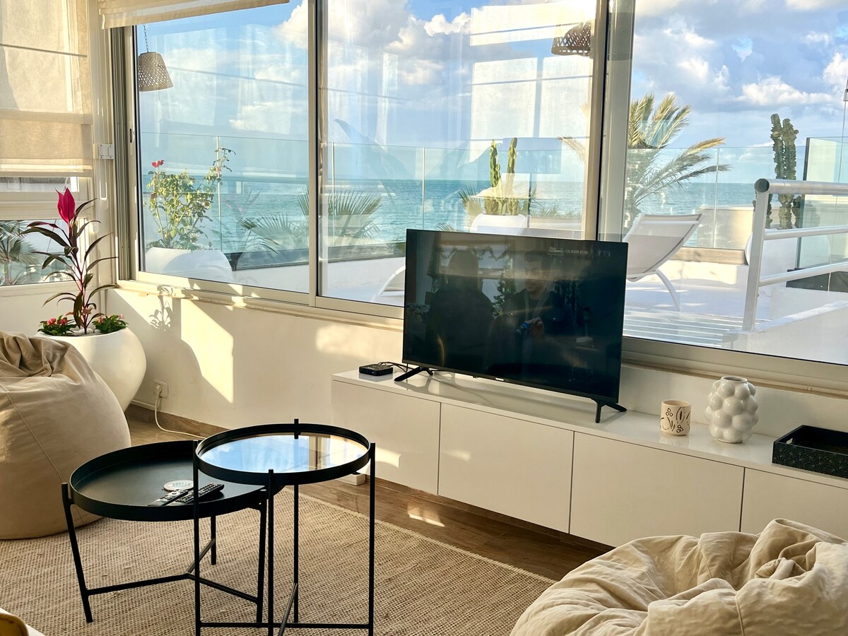 Discover our beautiful waterfront house in the heart of La Marsa, with its splendid terrace offering breathtaking panoramic views of the sea. The living room, fully glazed, allows you to enjoy this breathtaking view at all times. Beautifully decorated and fully equipped, it feels truly like home. With its two elegant bedrooms and a great location, this house combines luxury, comfort and tranquility for a memorable stay.