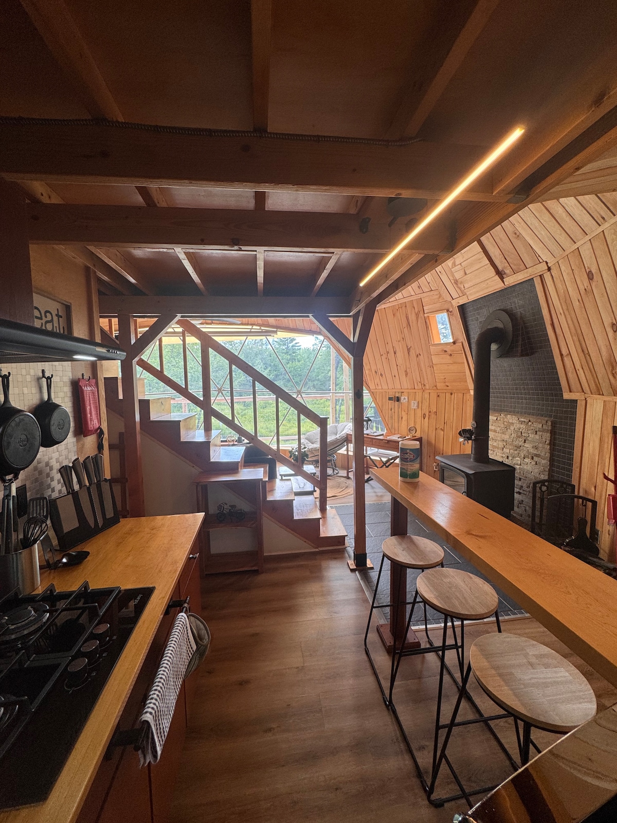 The Streamside Getaway offers a luxurious glamping experience in a new solar and wind-powered Geodome. Equipped with custom furniture, new hot tub,luxury appliances, free high speed wifi, AC/Heat Unit and modern bathroom and kitchen facilities, guests can enjoy a homely and comfortable stay in nature. A glamping site built in 2022 offers a contactless check-in process with a custom key code. Additionally, we have added archery, axe throwing, and kayaks to enhance your outdoor activity!