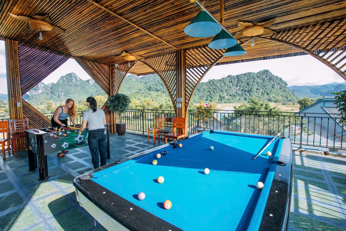 Welcome to Our Guest Favorite Room! Our cozy double room with breathtaking mountain views is a top choice among guests. With its warm atmosphere, comfortable bed, and private bathroom, it’s ideal for couples or solo travelers seeking both comfort and charm. The large windows bring in plenty of natural light, making it a perfect spot to wake up with the beauty of Phong Nha right outside. After exploring caves and rice fields, unwind by the pool or simply enjoy the peaceful garden setting.