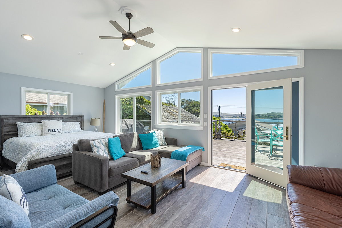 Enjoy Bodega Bay and the stunning west end of Sonoma County in this beautifully restored waterfront home. Featuring a large open kitchen with 1 private queen bedroom and bath on the top floor; and 1 bedroom with king-size bed and large jacuzzi bath downstairs. Unforgettable views of migratory birds, the harbor and the Pacific from all rooms. We are also excited to announce a new EV charger for our guests! This is a J1772 plug for most non-Tesla vehicles. Tesla owners, bring your adapter.