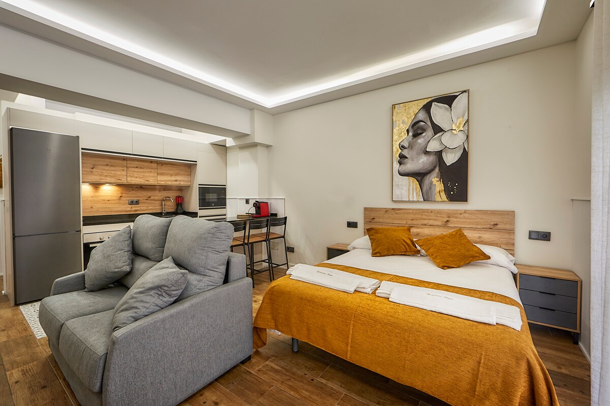 Enjoy a comfortable stay in this elegant, fully equipped studio, located in the heart of Valladolid. Double size bed and a couch. Smart TV and WiFi AC and heating for your comfort in any time. Full kitchen with washer/dryer, dishwasher, coffee maker, microwave, kitchenware... Private bathroom: towels, gel, shampoo and conditioner Inflatable bed available on request. Steps from Plaza Mayor. Independent access. Ground floor dwelling