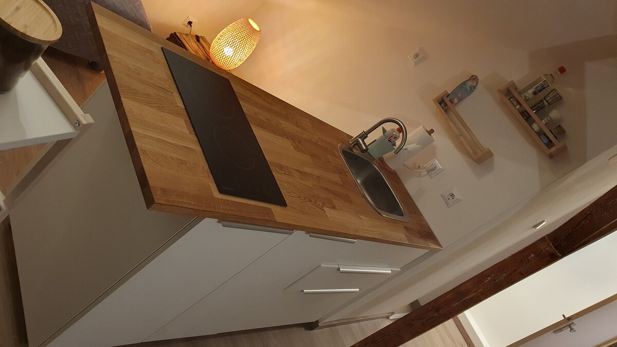 Welcome to our home! Behind our house, a new, modern apartment awaits, perfect for relaxing. Enjoy a summer kitchen, stylish shower bathroom, and an open bedroom with a cozy double bed (1.60 x 2.00 m). The private wooden terrace in the greenery is ideal for morning coffees and quiet evenings with wine. Best of all? The whole apartment is yours – no stress, just peace!