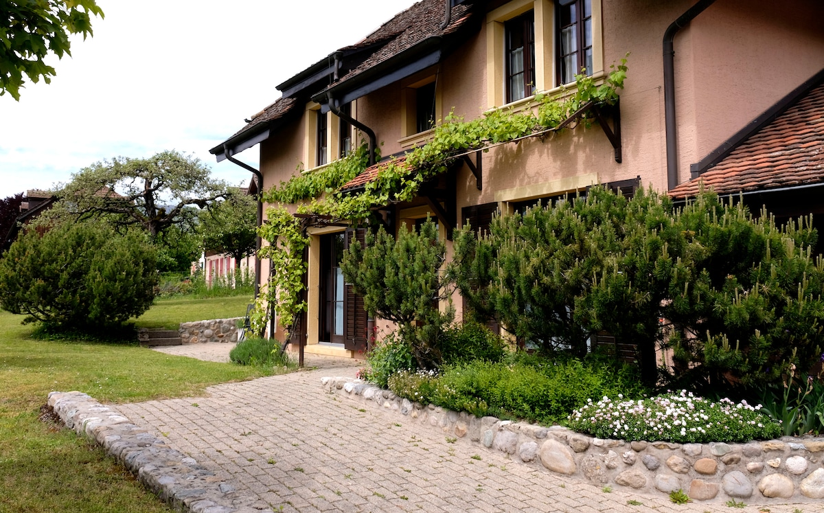 Private apartment (up to 3 people) with garden and stunning views of Lake Neuchâtel. Independent access, bathroom, equipped kitchen and nice garden with patio, covered terrace and pergola. 10 min walk to the lake, tram and train station. The place is quiet and cozy.