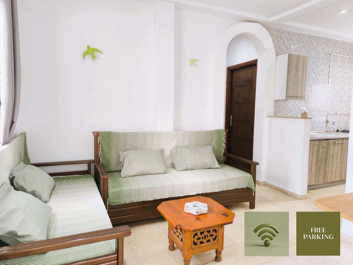 ◇ I offer you my spacious and decorated air-conditioned apartment. ♡ a quiet place both to rest and close to the tourist area to have fun. you can park your car on the street below the apartment. (street with no through traffic) it's a typically Tunisian quiet and family-friendly neighborhood.
