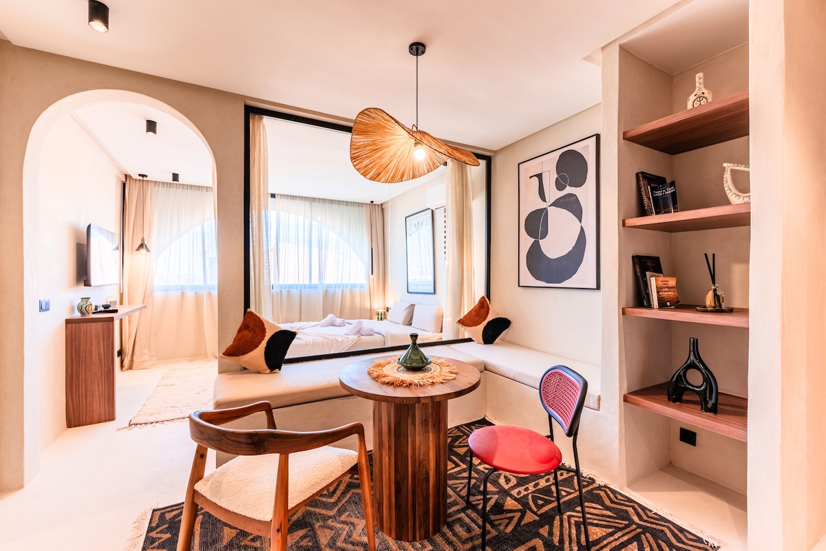 Discover this bright apartment ideally located opposite the Jardin Majorelle and the Yves Saint Laurent Museum. Perfect for a romantic or business stay, it offers a double bed, equipped kitchen, fiber optic Wi-Fi, air conditioning, modern bathroom and self check-in. Close to cafes, galleries and the Medina. Comfort, style and exceptional location await you in Marrakech!