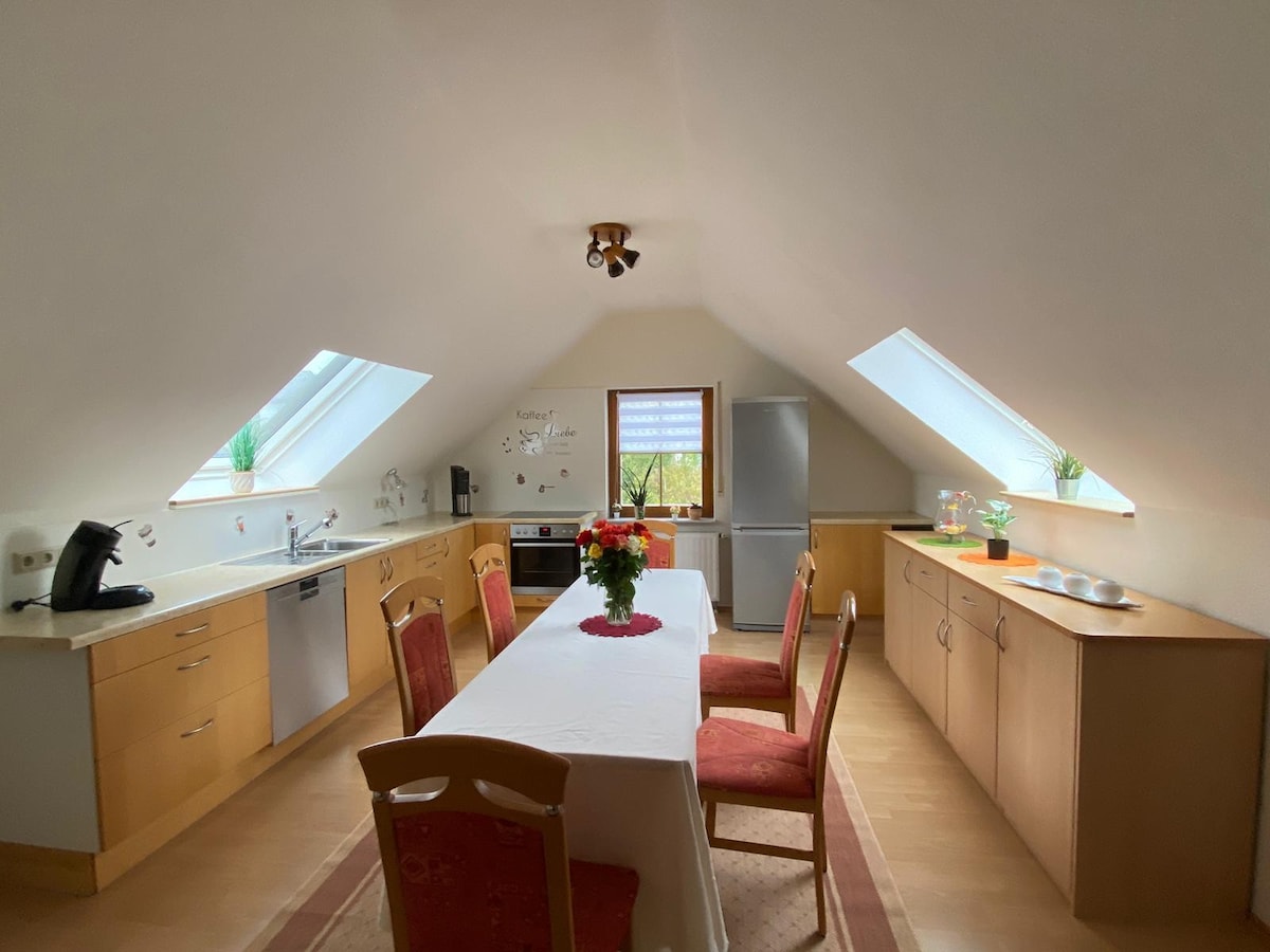 Our apartment 1 is an 80 sqm, bright and very nicely furnished apartment with large bathroom, kitchen and dining-living room. A double room and a triple room, with the single bed on a gallery accessible via stairs. Overlooking Philippstein Castle.