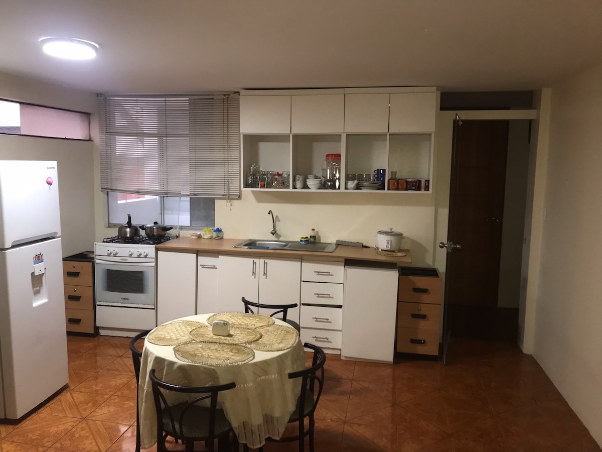 Welcome to our cozy retreat! This apartment offers privacy and a grill area to enjoy the outdoors. Located in a quiet and safe area, just minutes from Miraflores. Ideal for couples looking to relax and explore the city. With a separate entrance and on the 1st floor, an equipped kitchen and an outside window, a comfortable double bed, cable TV, a hot water shower, a laundry room with a clothesline, and fast WiFi. Book now and enjoy a perfect getaway!