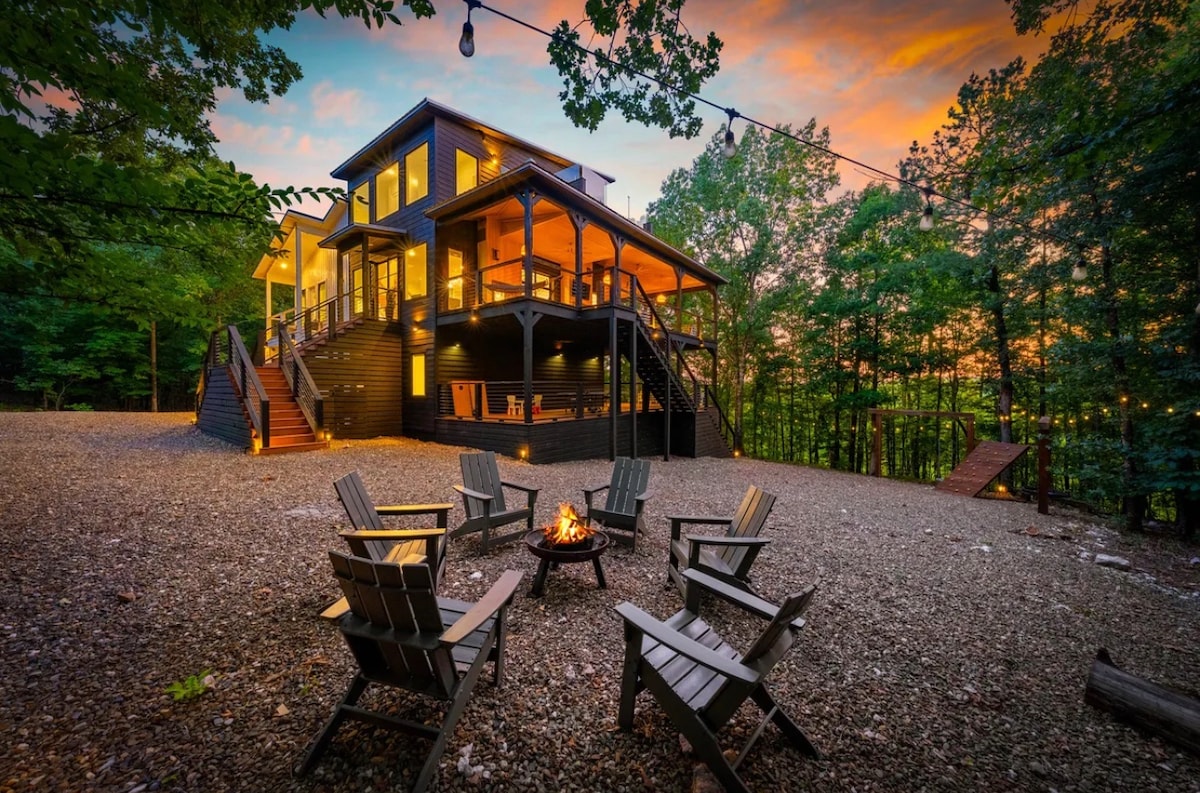 Luxury creek-side escape on 2.5 private wooded acres where the only sounds are flowing water and birdsong. This brand-new designer build sleeps 10 with a detached king suite for ultimate privacy. Minutes from Hochatown but feels like deep forest seclusion—the upscale Broken Bow retreat that ruins all others. • Hot tub in the trees overlooking the creek • Fire pit under the pines for stargazing • Kids' playground + arcade + karaoke • Spa finishes & premium everything throughout